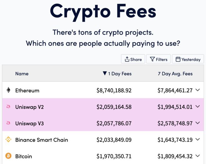由名字不难猜出,这款工具会列出过去24小时或7天内每种网络的手续费信息。这些信息可作为分析区块链网络流量和使用情况的简单指标。费用高昂的网络通常需求量也大。