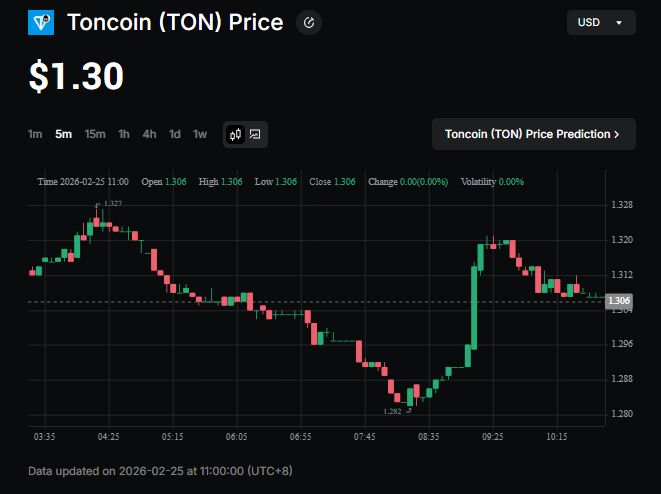 • 当前市场价格:截至2026年2月24日,TON交易价格约为1.30至1.38美元,较2025年峰值下跌近65%。