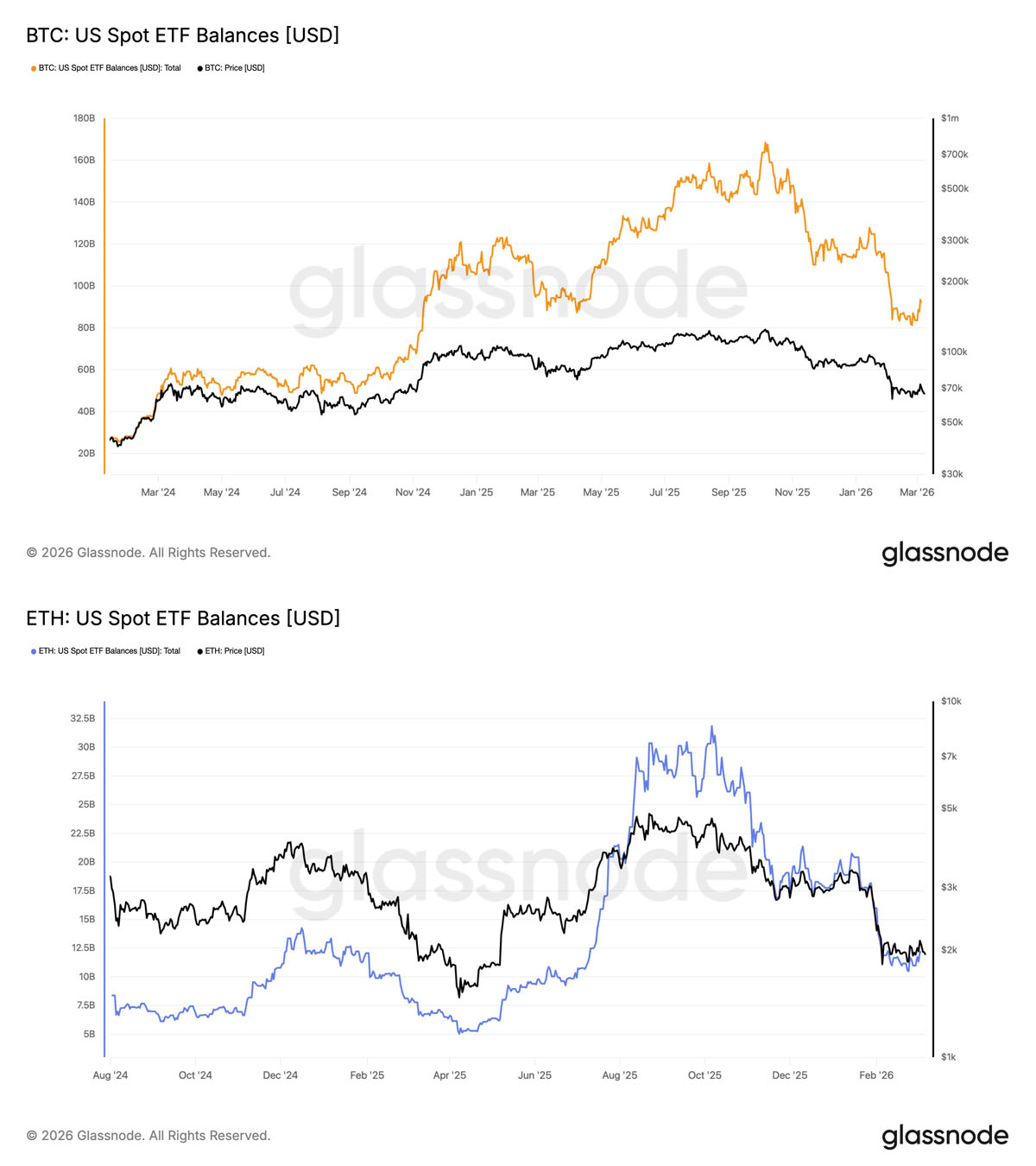 美国比特币和以太坊 ETF 余额。来源:Glassnode