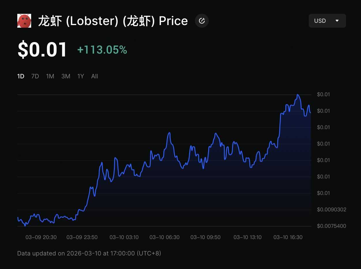 迷因币龙虾作为这一文化时刻的链上反映而出现。它在2026年3月初开始吸引市场关注,在2026年3月2日交易的首几小时内录得约150%的涨幅。根据GMGN数据,到2026年3月9日,其市值一度超过1000万美元,单日涨幅超过190%。