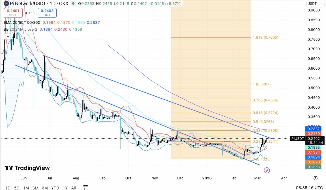 Pi Coin (PI) 目前处境微妙,它正试图在更大的下跌趋势中进行短期反弹。当前价格在 0.20 美元至 0.24 美元附近波动,表明其在从 0.13 美元至 0.14 美元的支撑区域反弹后进入盘整阶段。交易员们正在密切关注可能决定 PI 下一步走势的关键价位。