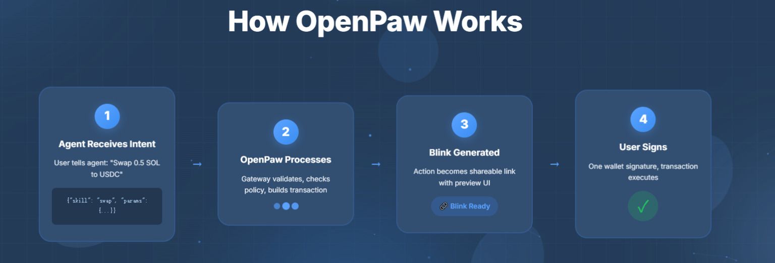OpenPaw 是一个 Web3 项目,旨在为区块链上的 AI 代理提供基础设施。该平台使自主软件代理能够通过钱包签名和 Solana Actions 直接执行区块链交易,而无需中央控制。