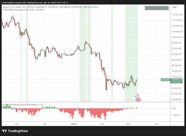 几个月来,传统市场一直目睹黄金的表现远超比特币。这种落后局面在2月底结束。这种转变并非空穴来风,而是有确凿数据支撑的。伊朗冲突爆发后,比特币上涨了8.09%,而黄金则下跌了0.42%。市场开始意识到,地缘政治的必然性、美国ETF的持续资金流入,以及由MicroStrategy STRC溢价驱动的约1.3亿至1.8亿美元的幕后买盘,共同促成了这一趋势。