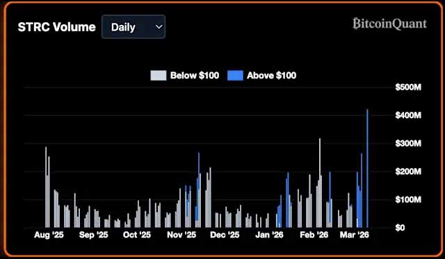 MicroStrategy STRC交易量增加,推高了比特币现货需求。