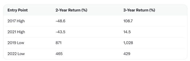 而在熊市低点附近建仓,则实现了更高的收益。2019年谷底附近买入,两年后收益达到871%,三年则为1028%。