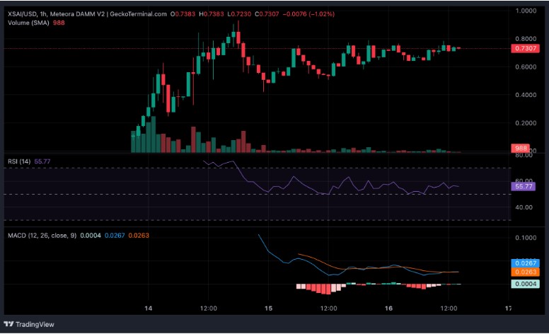 XSAI 代币于 2026 年 3 月推出后不久,其价格一直在 0.66 美元至 0.73 美元之间波动,但由于流动性低,其价值波动很大。