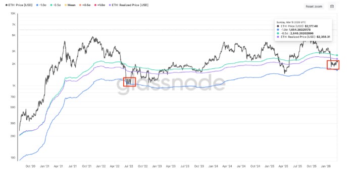 ETH始终在由2350美元实现价格上限与1650美元MVRV最低区间形成的宽幅区间内震荡。