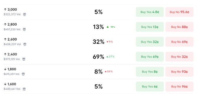 交易者目前给予ETH在三月触及2800美元概率为13%,较过去24小时上升10个百分点。2600美元和2400美元目标位的看涨信心更强,分别为32%和69%。