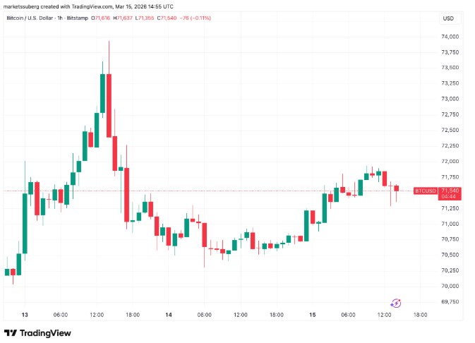 TradingView数据显示,盘外时段价格一度逼近72000美元后回落。