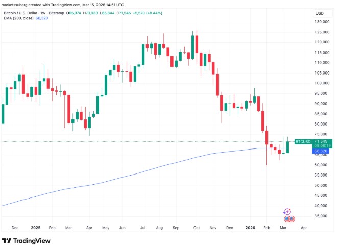 比特币接近每周收盘价站上7万美元的重要关口,这将重新夺回关键的200周趋势线。