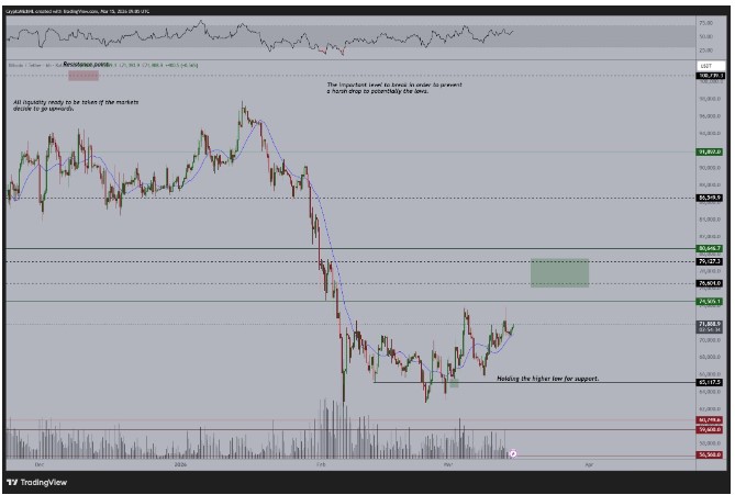 比特币当前在7万美元附近盘整,短期受技术支撑和机构“鲸鱼”买盘支撑,仍具上行潜力,但MACD仍为负、油价与通胀担忧可能限制涨幅,若价格稳守73,700美元以上并消化宏观压力…
