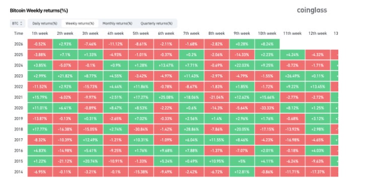 BTC周度收益(屏幕截图)。来源: CoinGlass