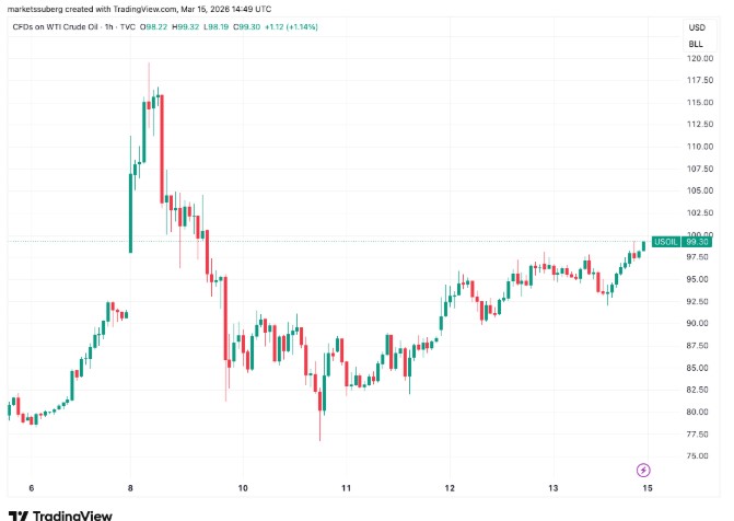 WTI原油本周末试图重新突破每桶100美元,全球石油供应冲击仍在持续。