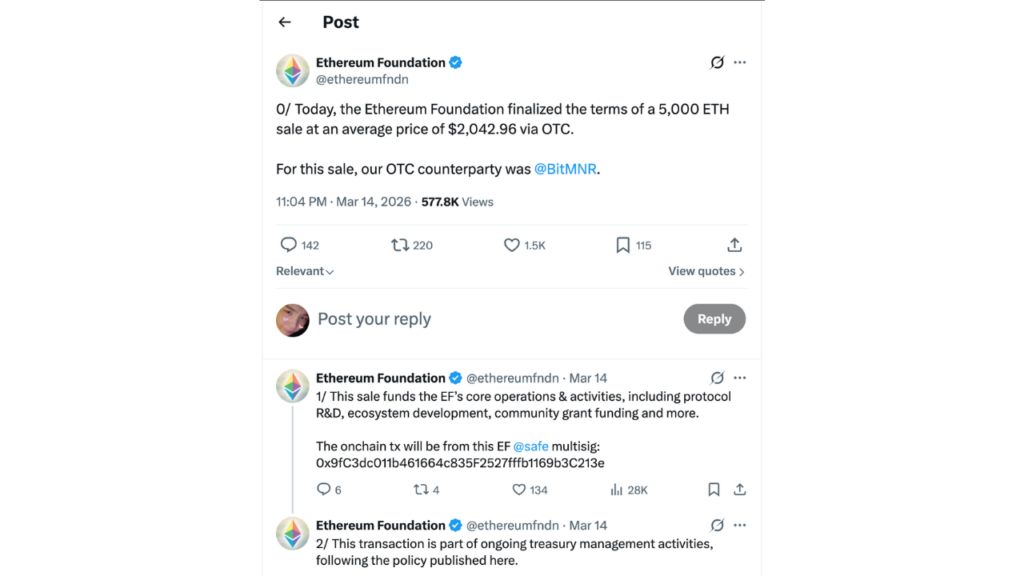根据 X 上周六发布的一篇文章,ETH 的平均售价为每枚 2,042.96 美元,所得款项将用于资助该基金会正在进行的运营和发展计划。
