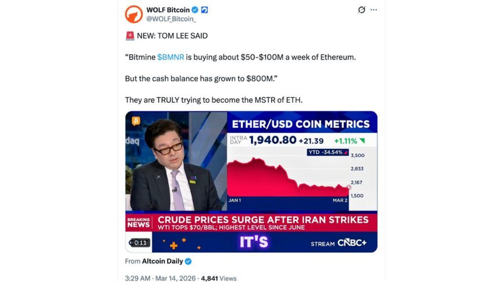 自 2025 年中期以来,BitMine 一直在积极积累 ETH,其策略类似于 Strategy(前身为 MicroStrategy)首创的比特币国库策略。
