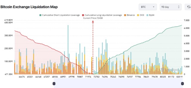 BTC流动性密集区位于7.5万美元上方