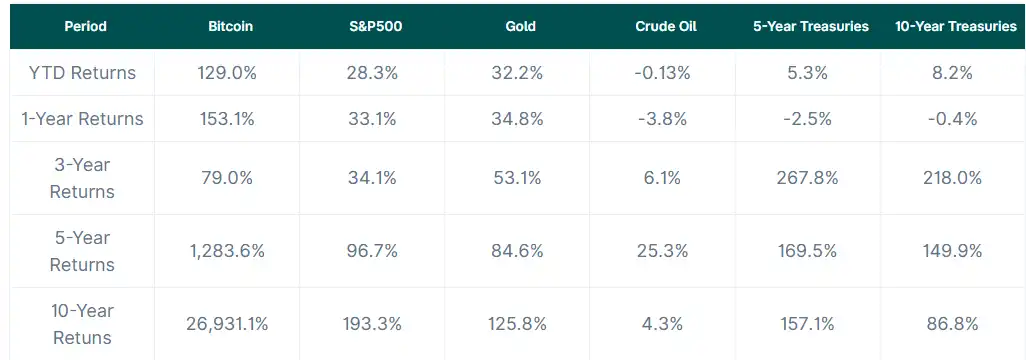从长达十年的时间跨度来看,比特币的增长率达 26,931.1%,无人能及,这充分证明了它对早期投资者的巨大投资潜力。尽管其他资产的回报率远不及比特币,但它们仍然能够提供稳定的收益,例如标普 500 指数的回报率为 193.3%,黄金的回报率为 125.8%。美国国债也维持着价值,五年期国债的回报率为 157.1%,十年期国债的回报率为 86.8%。然而,原油的回报率仅为 4.3%,表现远逊于其他资产。