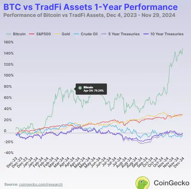 2026 年的表现与 2024 年截然不同,作为参考,以下为 2024 年比特币与其它资产类别的表现(发布于 2024 年 12 月)。
