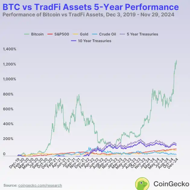 不同时间跨度的表现揭示了每种资产的优劣势。在 2024 年,比特币是表现最好的资产,回报率为 129.0%。黄金紧随其后,年初至今回报率为 32.2%,展示了其作为传统价值储存手段的可靠性。标普 500 指数保持强劲,回报率为 28.3%。然而,原油价格下跌,回报率为 -0.13%,而美国国债提供了适度的回报,5 年期国债为 5.3%,10 年期国债略高,为 8.2%。