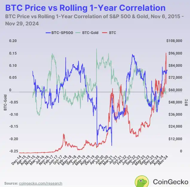 除了波动性,比特币与标普 500 指数和黄金等其他主要资产的关系,可以进一步揭示其独特的行为。相关性分析揭示了比特币如何与传统市场保持同步或脱节: