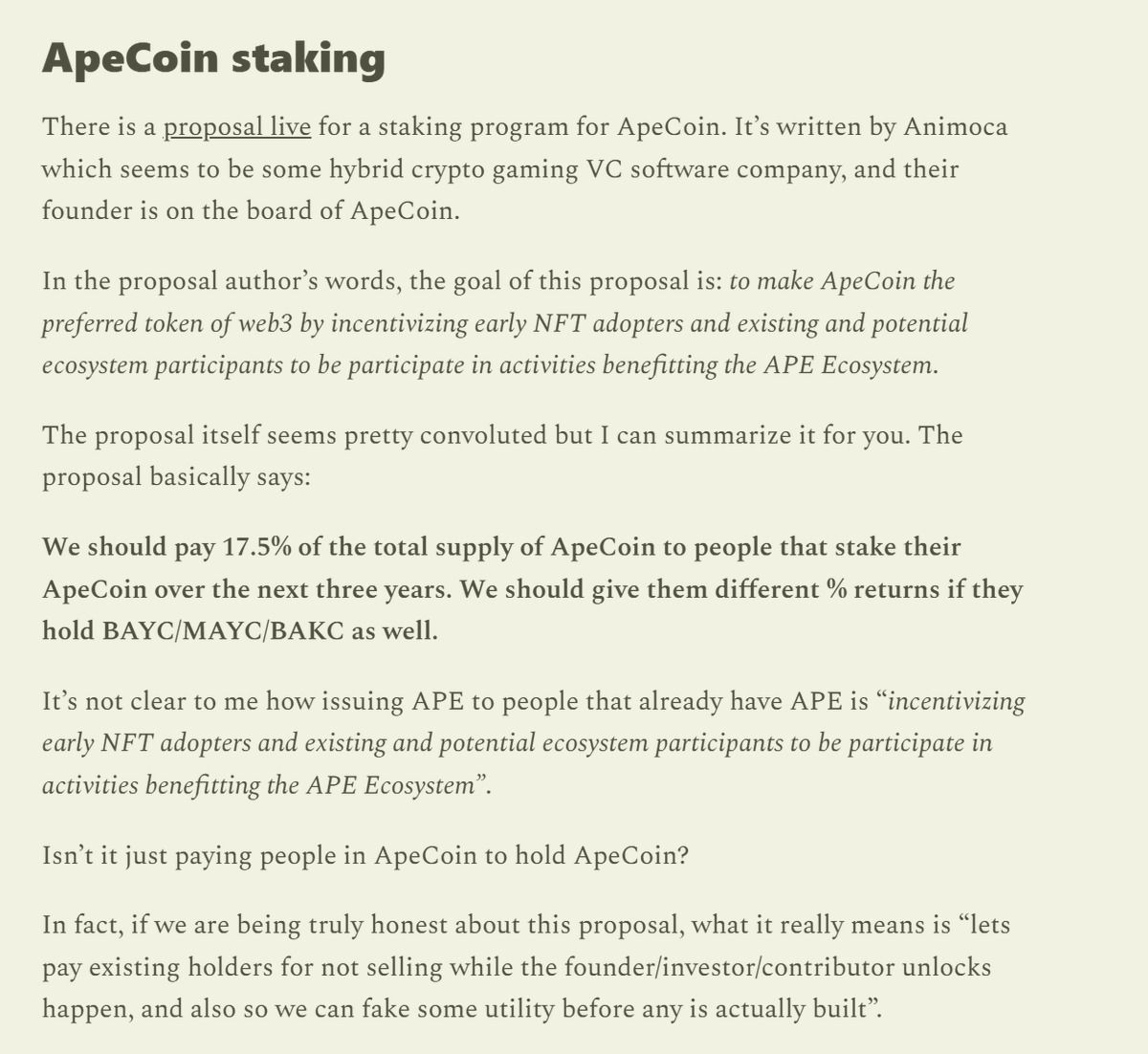 这种机制也伴随风险。历史上已有类似结构导致严重问题的案例。参见 Cobie 的相关文章:“ApeCoin 与质押机制的衰亡”