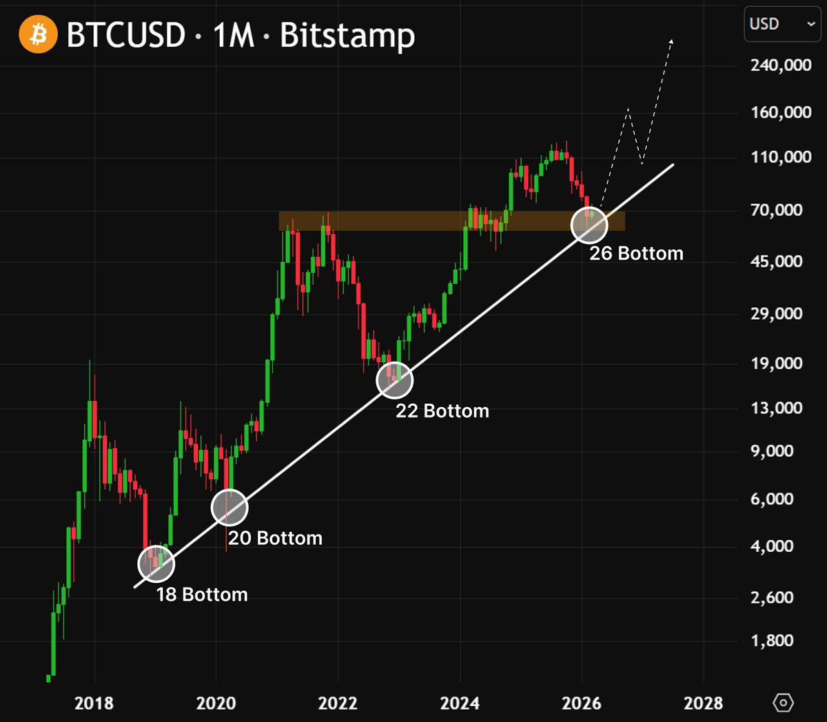 STRC增加了新的需求层面,因为比特币正重新测试其月线图上为期六年的上升趋势线支撑位。