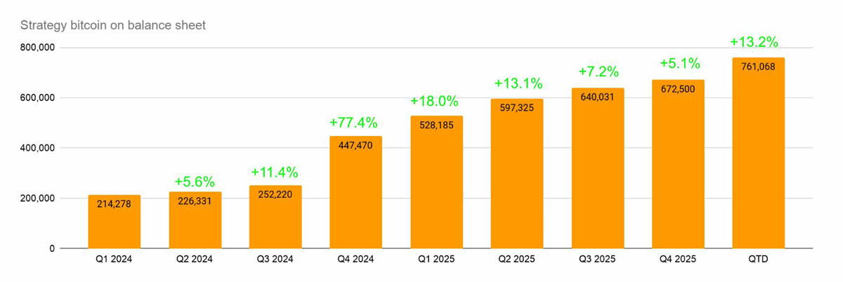 Strategy公司2026年第一季度迄今的比特币持仓量环比增长13.2%,使该公司有望实现自2024年第四季度以来最快的季度增持速度。