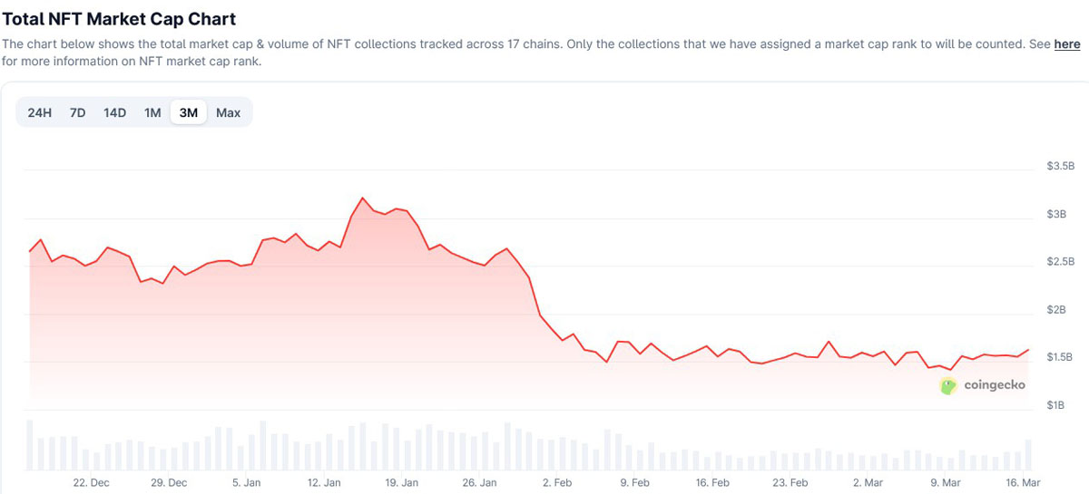 过去三个月 NFT 市值的变化。来源:CoinGecko