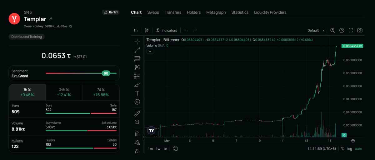 $Templar (SN-3):主角Templar 7天内上涨75%,称为了Bittensor当前捕获Emission排放的龙一。当前Market Cap仅为 70m