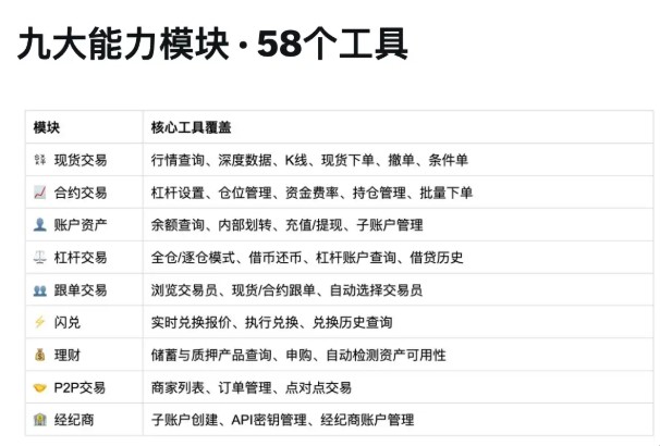 这次上线的 Agent Hub,9 大模块、58 个工具,把交易所里会产生的操作需求几乎全部开放给了 AI: