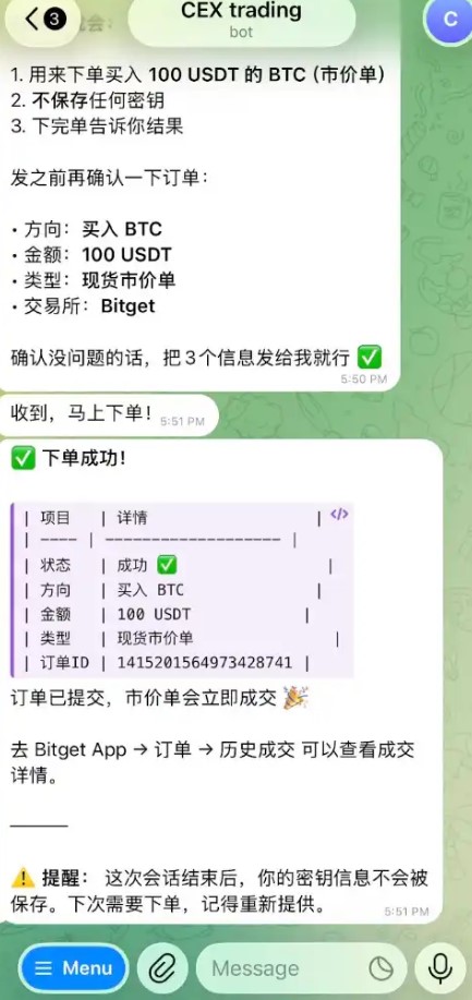 Agent 没有直接执行,先做了确认:方向买入 BTC,金额 100 USDT,类型现货市价单,交易所 Bitget,让你确认无误后再提供 API 信息。