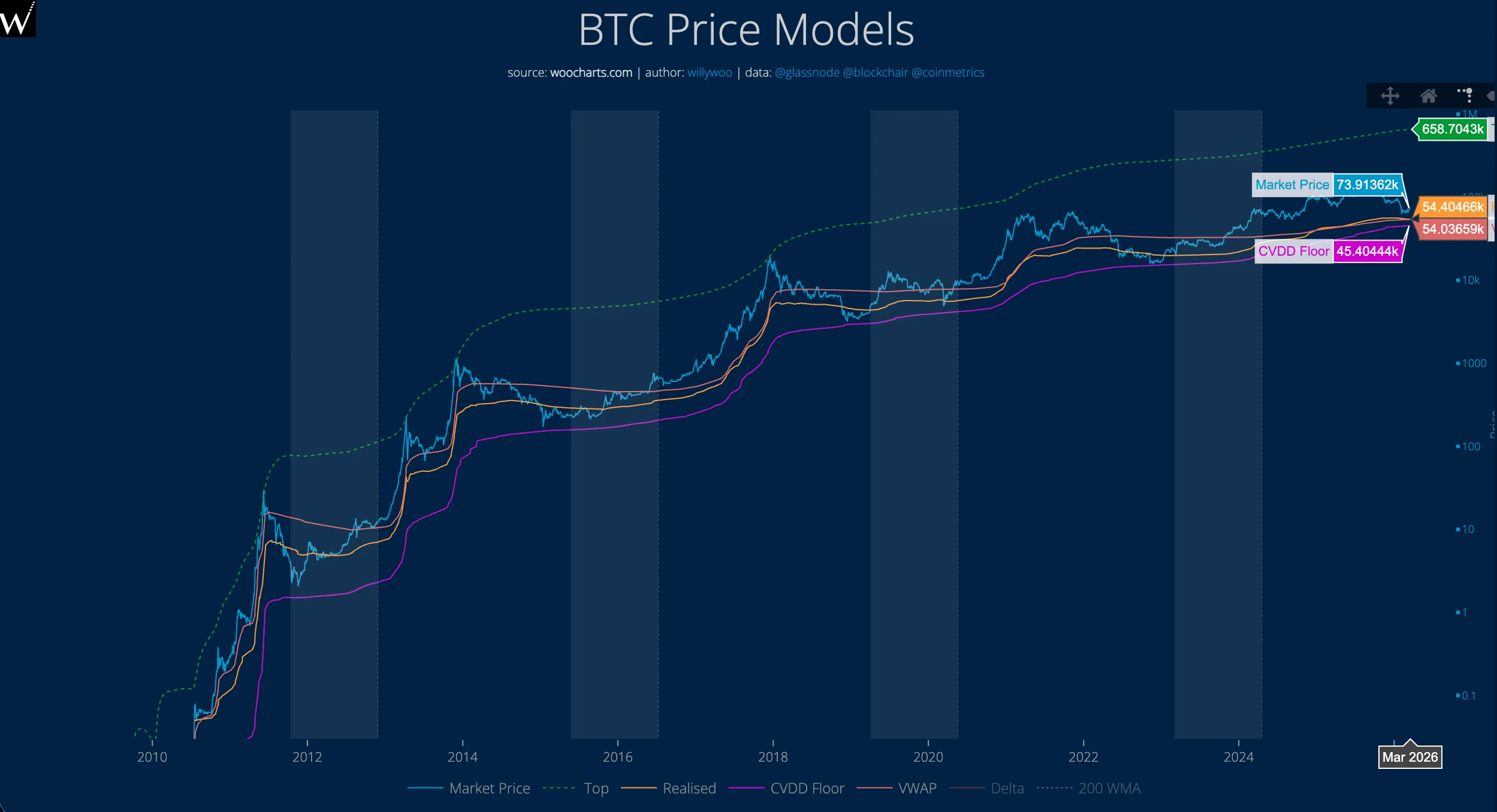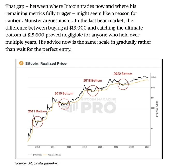 该指标由加密分析师 Willy Woo 开发,用于追踪 BTC 在不同价格区间的累积持有权重,构建一条“历史性铁底”曲线。