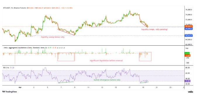 比特币价格跌破70,000美元,但较低时间框架上的多头友好形态预示将迅速反弹。