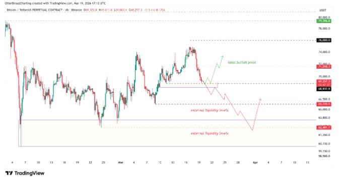 在较低周期图上,比特币正在形成与3月6日至3月8日回调期间类似的分形结构。当时价格下跌并触及内部流动性水平后实现反转。