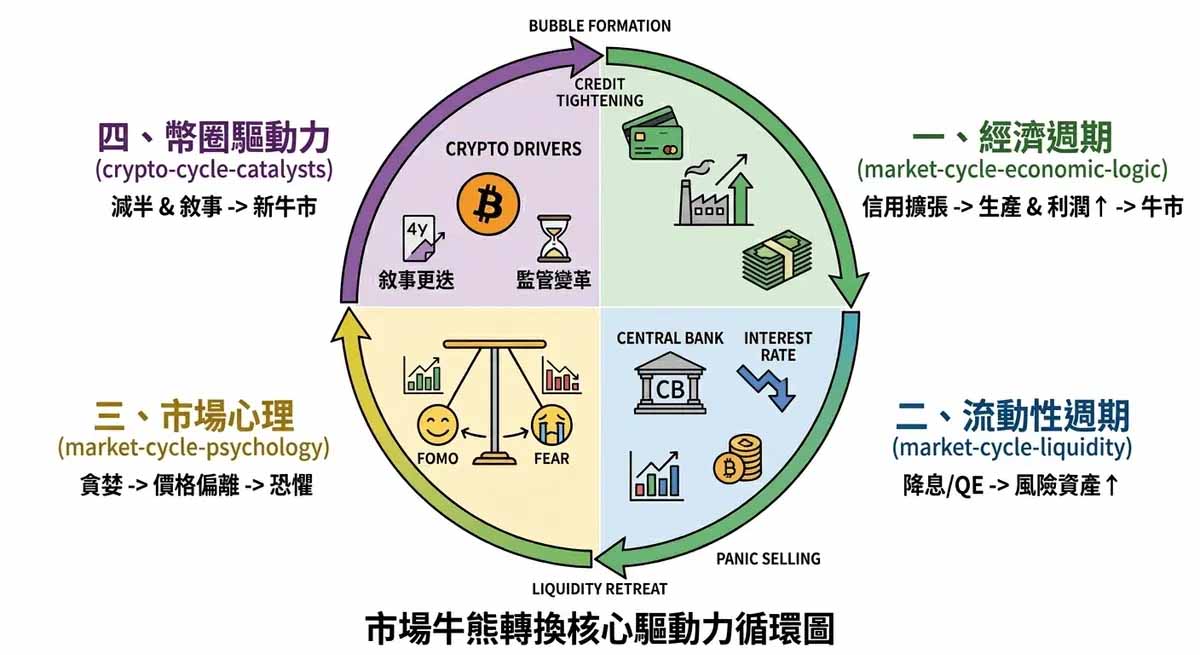 为什么市场无法永远上涨或永远下跌?牛熊转换原因可以归纳为四大内核驱动力。这些力量相互交织,共同推动了全球金融市场(包括币圈)的周期性波动。
