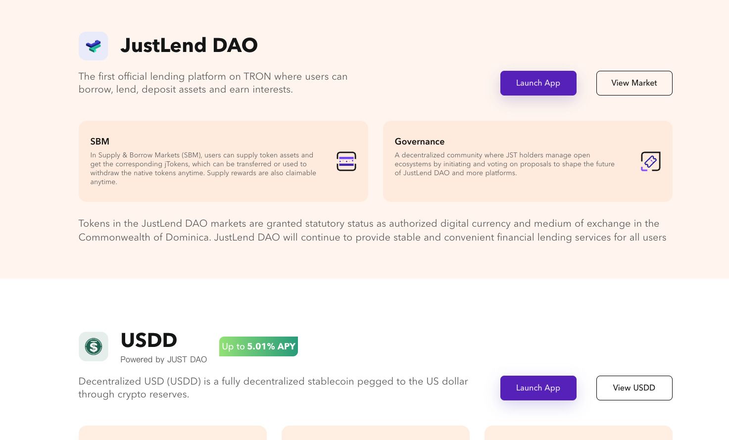 随着时间的推移,该生态系统已远远超出了最初的稳定币设计。如今,JUST 官方网站重点介绍了 JustLend DAO 作为 TRON 上第一个官方借贷平台,以及 USDD、sTRX、Energy Rental 和 JustCrypto 品牌下的跨链资产。