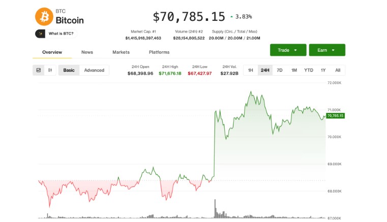 比特币在交易时段后期徘徊在 71,000 美元下方,过去 24 小时内上涨了 3.8%。其他加密货币表现更佳,其中以太坊 (ETH)、索拉纳 (SOL) 和狗狗币0.09344美元两者均增长约 5%。