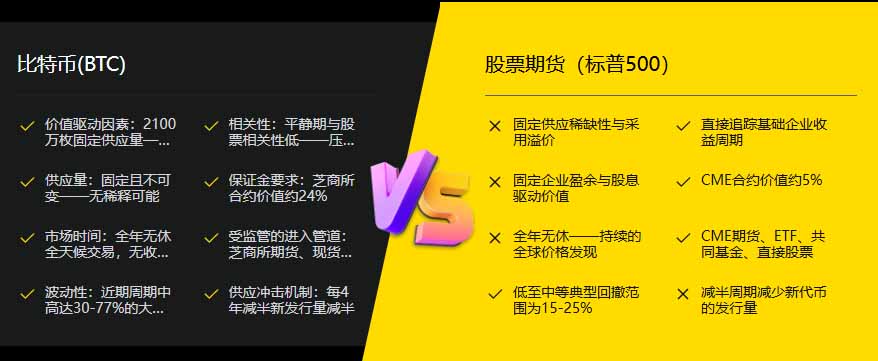 股票期货追踪企业盈利,比特币则追踪固定供应数字资产的采用率。价值驱动因素截然不同。