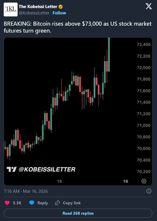 比特币(BTC)突破7.3万美元创月高,带动加密币股票大涨