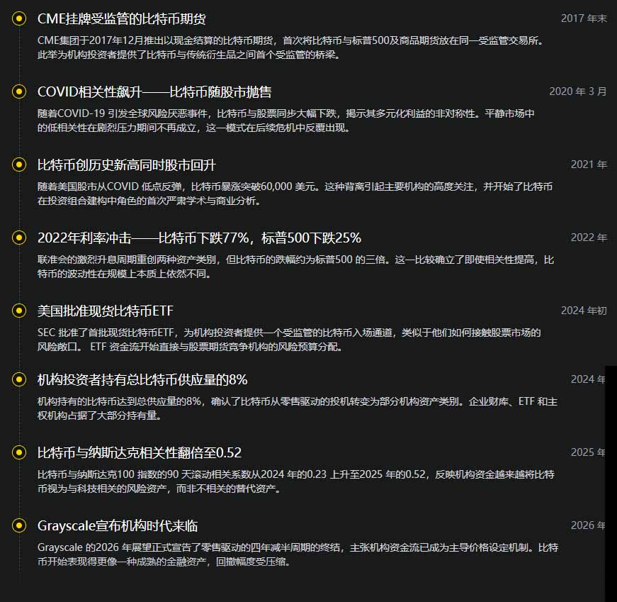 机构买盘压缩了回撤,并提升了比特币与股票的相关性。 Grayscale称2026年为数字资产「机构时代的曙光」。