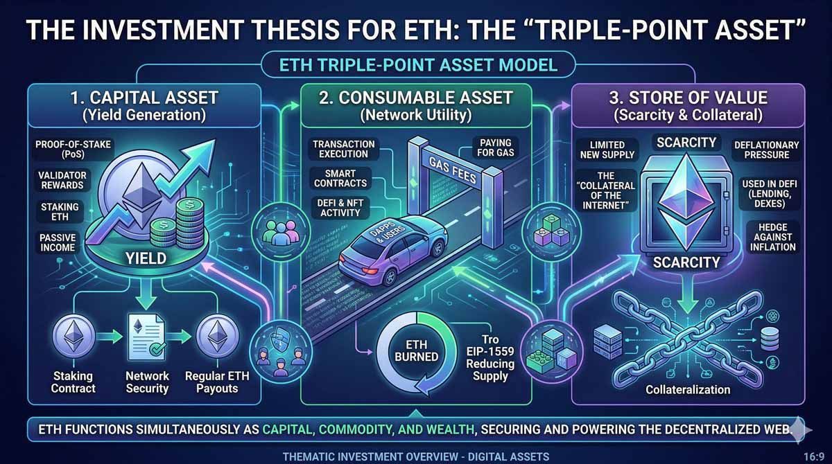 ETH 的投资论点已成熟为「三重资产」模式。它通过质押作为资本资产,通过网络费用作为消耗性资产,并因其稀缺性及作为「互联网抵押品」的角色而成为价值保存工具。在 2026 年,我们见证了「质押飞轮」的成果,企业财务部门和基金,包括哈佛管理公司等知名机构的公开披露,正在将资金配置于 ETH,不仅为了价格上涨,更为了 3–5% 的质押收益。