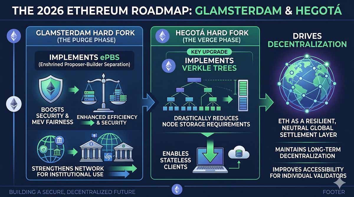 2026 年是以太坊技术演进的关键一年,由两次重大硬分叉定义:上半年的 Glamsterdam 和下半年的 Hegotá。这些不仅仅是维护更新,更代表了以太坊路线图中「The Purge」和「The Verge」阶段的成功运行。理解这些升级对投资者至关重要,因为它们直接解决了长期争议的「可扩展性与去中心化」权衡问题。