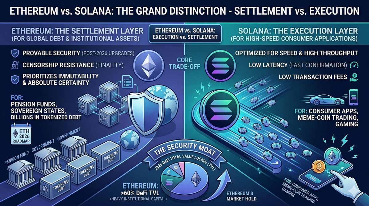 2026 年投资者最常问的问题之一是,以太坊是否正在被 Solana 等高速竞争对手超越,或者其自身的 Layer 2 生态是否正在「内部竞争」其价值。事实上,情况更为复杂。尽管 Solana 已在零售交易和高频应用领域占据重要利基,以太坊却更加专注于其作为「Layer 0」在 全球金融 中的角色。