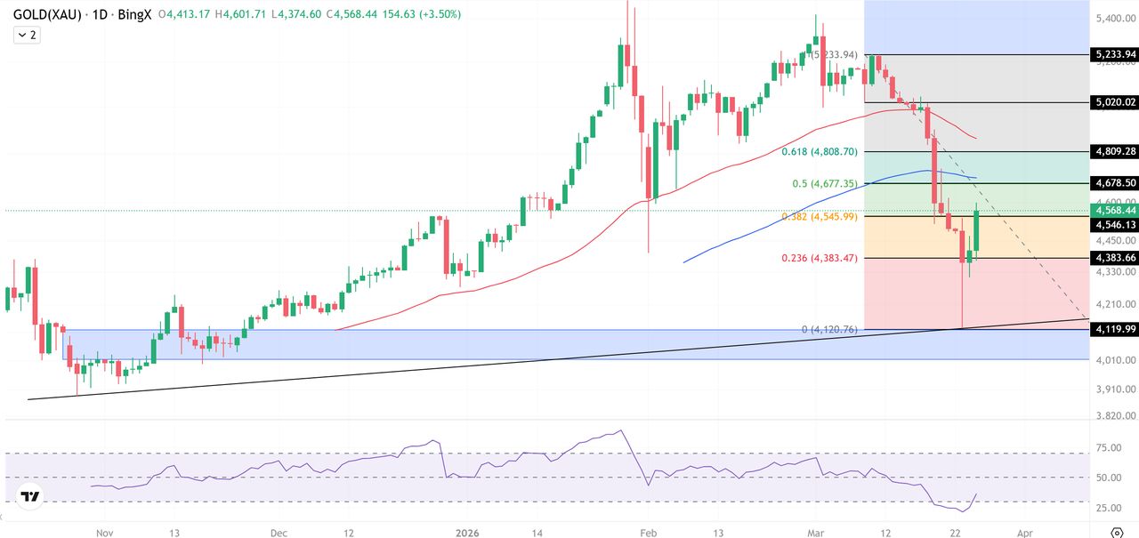 黄金 (XAU/USD) 在唐纳·川普总统出人意料的外交举动改变市场前景后,于 2026 年 3 月 25 日强势反弹,交易价格介于 4,570 美元至 4,585 美元之间。该金属刚经历了自 1983 年以来最严重的五日跌幅,从 5,400 美元的高点下跌近 25% 至 4,098 美元。现在,在美国将对伊朗能源设施的袭击推迟五天后,买家已重返市场。