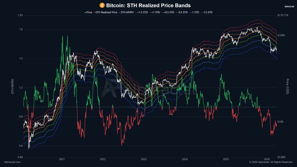 比特币 STH 实现了价格区间。来源:Alphractal