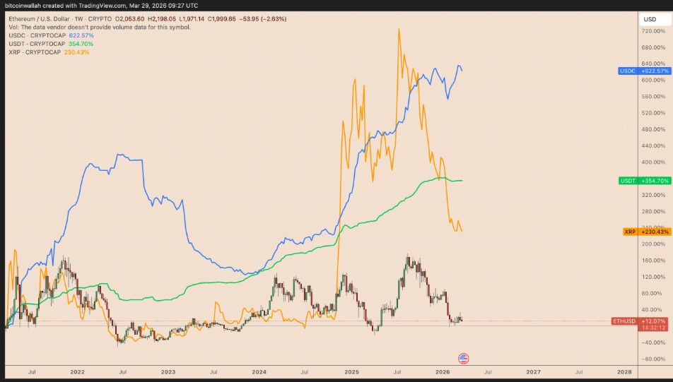 ETH/USD五年市值表现对比USDT、XRP和USDC。来源:TradingView