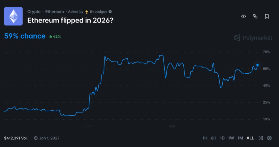 Polymarket交易员现在认为,ETH在2026年失去其加密货币第二名排名的真实风险正在上升,今年这一概率已从17%飙升至59%以上。