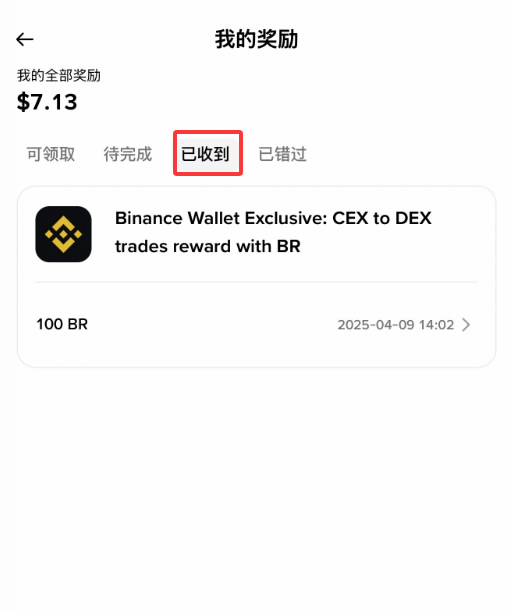 已收到:显示您已成功领取的奖励,或由币安直接发放的奖励。