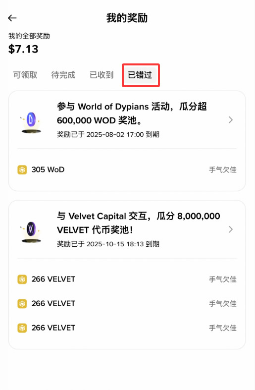 要查看过期或错过的奖励,请在【我的奖励】页面点击【已错过】选项卡。