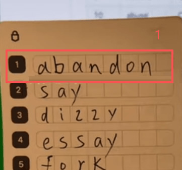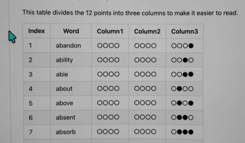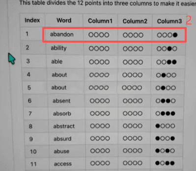 比如说第一个单词是「abandon」,我在表里找到这个词,看到它的点阵图是:前四个空着,中间四个空着,最后四个里面前三个也空着,只打最后一个点。
